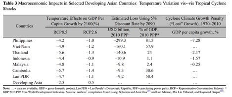 Indeed, empirical estimates such as those in the table below suggest that repeated cyclone exposure reduced cumulative GDP per capita growth in the Philippines by over 7% between 1970 and 2010. Forward-looking projections estimate cyclone-related losses equivalent to more than 80% of 2010 GDP (discounted to 2090), alongside additional substantial losses across several Southeast Asian economies.